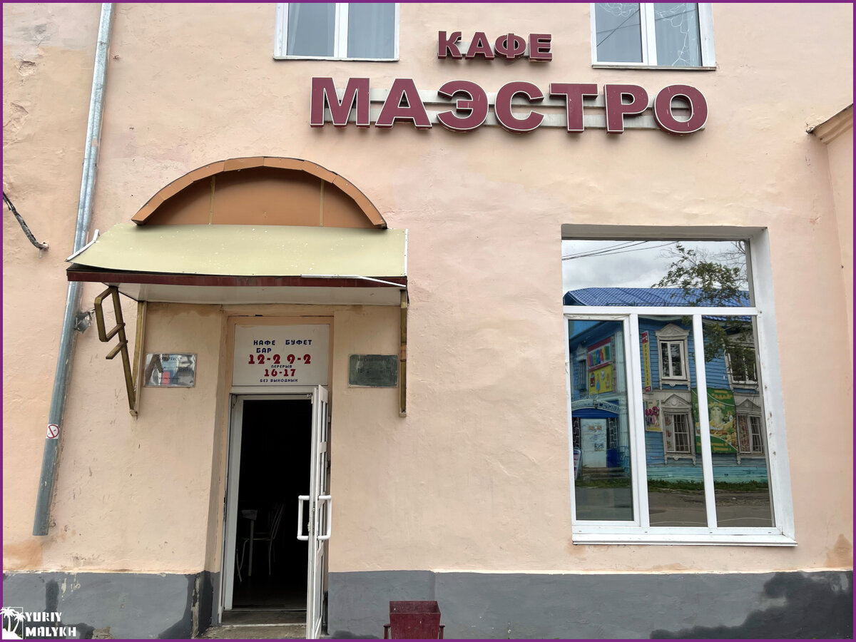 Удивившее меня своим меню кафе "Маэстро" располагается практически в самом центре провинциального городка Николаевск-на-Амуре. Городка, в котором из-за шторма я и моя группа застряли на двое суток по пути к мысу Врангеля в Охотском море. Поскольку осматривать в городе особо нечего, а время как-то убивать надо, я отправился изучать местный общепит. Ну а почему нет - когда еще доведется сходить в столовки в низовьях Амура. Заведений тут не так много, и свой выбор я делал вообще случайно. Вывеска говорила, что это кафе, как и большая часть других, принадлежит одному и тому же индивидуальному предпринимателю, судя по фамилии - армянского происхождения. "Ну давайте поглядим, чем кормят армяне на Дальнем Востоке", - сказал я себе, переступая порог "Маэстро". Внутри меня встретил старый добрый Советский Союз. Прямо напротив входа, в предбаннике, сидела бабушка за прилавком с пирожками. Интересненко, а где кафе? Налево! Зайдя в само кафе, я обрадовался, потому что понял: пришел по адресу! В