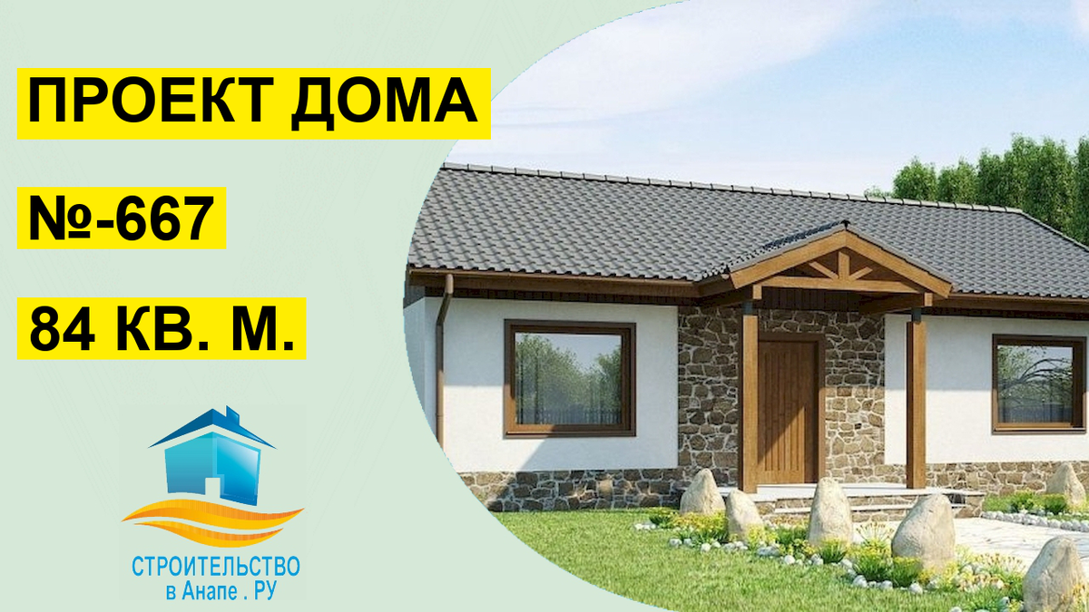 Проект одноэтажного дома 84 квадратных метров (№-667) на побережье Черного моря. Индивидуальный коттедж на побережье Чёрного моря - голубая мечта для большинства граждан нашей страны. Нехватка тепла и солнца в средних регионах РФ, сложные условия работы и жизни в сибирских регионах подталкивают задуматься о приобретении жилья на юге. Главный этап в воплощении мечты о своей недвижимости - проект одноэтажного дома 84 квадратных метров (№-667). Наша компания занимается строительством и проектированием в Анапе. Архитекторы, проектировщики разработали десятки домов разнообразной планировки и площади. Вас интересует особое решение? Задавайте задание и мы предоставим проект, предварительные расчеты на указанную вами эл. Почту. Поверьте нашему многолетнему опыту, который сделает вашу жизнь на
