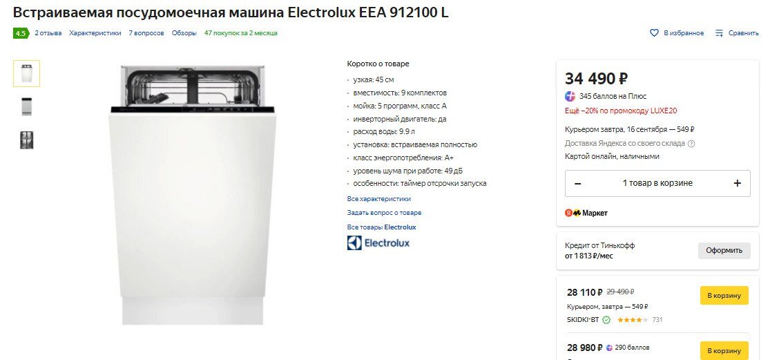 Встраиваемая посудомоечная машина Electrolux EEA 912100 L за 27592₽ с промокодом: LUXE20 на Яндекс.Маркет. Вмещает 9 комплектов посуды, расход воды 9.9 литров, уровень шума при работе 49 дБ, 5 программ мойки. На данный момент лучшая цена!