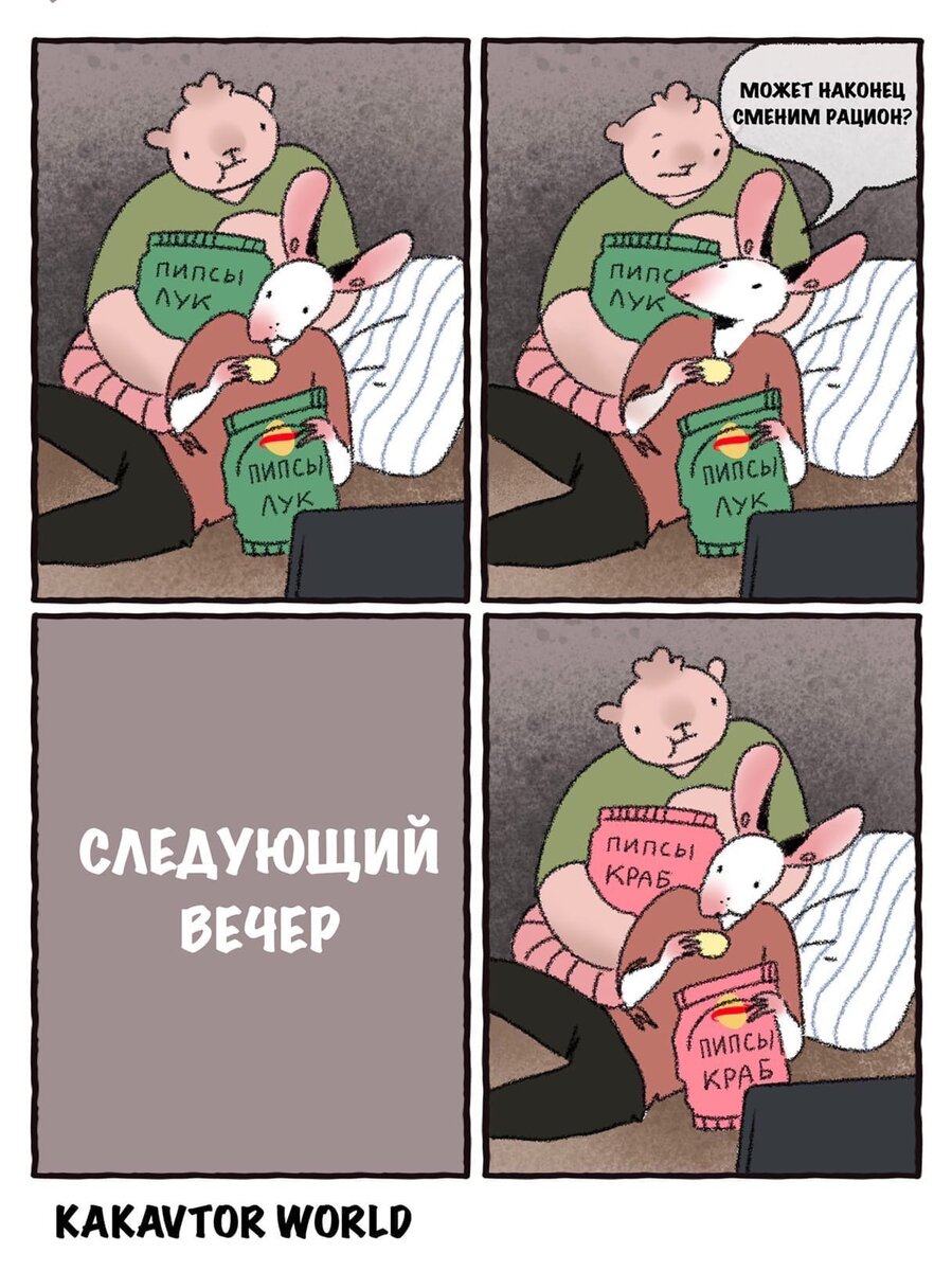 Да, снова «жиза», да снова забавные комиксы про отношения, но что поделать, если, во-первых, это очень популярный жанр, ну а во-вторых, даже в рамках него постоянно обнаруживается что-то самобытное и интересное. Вот и на этот раз я наткнулся на одну необычную и смешную серию комиксов. Необычная она хотя бы тем, что в качестве ее главных героев выступают животные, которые, казалось бы, вряд ли смогли бы сойтись в реальной жизни. Ну а еще меня зацепил юмор, который совсем не похож на типичные миленько-приторные зарисовки о большой любви, кроющейся в мелочах. Тут у нас скорее простые и честные истории о самых разных (и не всегда приятных) ситуациях. В общем, надеюсь, что вам тоже понравится. КакАвтор world - это название творческого паблика Вконтакте московской художницы Веры Палкиной. В своей группе Вера делится с читателями различными иллюстрациями, фанартами, а также выкладывает небольшие комиксы. Первые записи на страничке КакАвтор world начали появляться в сентябре 2016 года - с тех