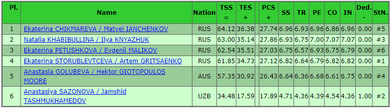 Российские спортивные пары - вне конкуренции на четвертом этапе Гран-при среди юниоров по фигурному катанию. Первые четыре места после исполнения короткой программы занимают российские дуэты: лидирует пермская пара Екатерина Чикмарева и Матвей Янченков, Наталья Хабибуллина - Илья Княжук и Екатерина Петушкова-Евгений Маликов расположились соответственно на второй и третьей строчке турнирной таблицы. В шаге от пьедестала остановилиcь Екатерина Сторублевцева и Артем Грицаенко. Посмотреть фотографии, результаты, протоколы, список использованной парами музыки, а также насладиться лучшими элементами короткой программы можно в этой статье. Результаты короткой программы: Итоговые протоколы: Фотографии (листайте): Музыкальное сопровождение, выбранное парами для короткой программы: Лучшие элементы короткой программы пар (по мнению судей): Лучшая подкрутка В номинации "Лучшая подкрутка" победа достается российской паре Екатерине Чикмаревой и Матвею Янченкову. Лучший выброс Судьи не смогли выбрат