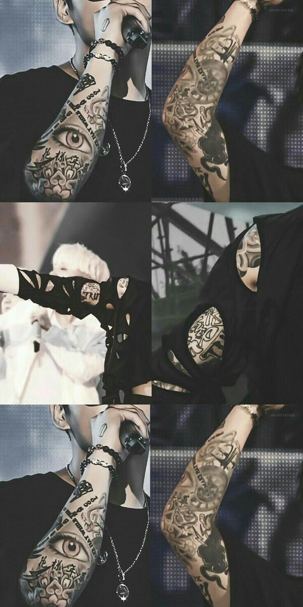 Ровно 2 года назад Чонгук показал нам свои татуировки. На данный момент у него забита рука полностью буквально в пальцев и до плеч (не точная информация, арми не показывали есть ли продолжение его тату) «ARMY» — это фандом BTS, но это слово также содержит R и M, как RM и «Мин Юнги». Стоит отметить, что «A» в ARMY — это перевернутая «V» для Ви, а «J», как полагают, представляет Джина, Чимина и Джей-Хоупа. Таким образом, Чонгук отразил имена всех участников BTS, и высказал им этим свое уважение. 2. Сердце и 0613 Хотя Чонгук не подтвердил предположения поклонников о значении его татуировок, сердце считается выражением вечной любви Чонгука к своим согруппникам и фанатам. «0613» означает дату дебюта BTS — 13 июня 2013 года. 3. . Корона и смайлик Корона может обозначать статус BTS как королей K-Pop, а смайлик, в свою очередь, может быть любимым смайликом Чонгука или просто стилистической деталью. 4. Щит Щит на руке Чонгука представляет собой лого АРМИ. Интересно отметить, ч