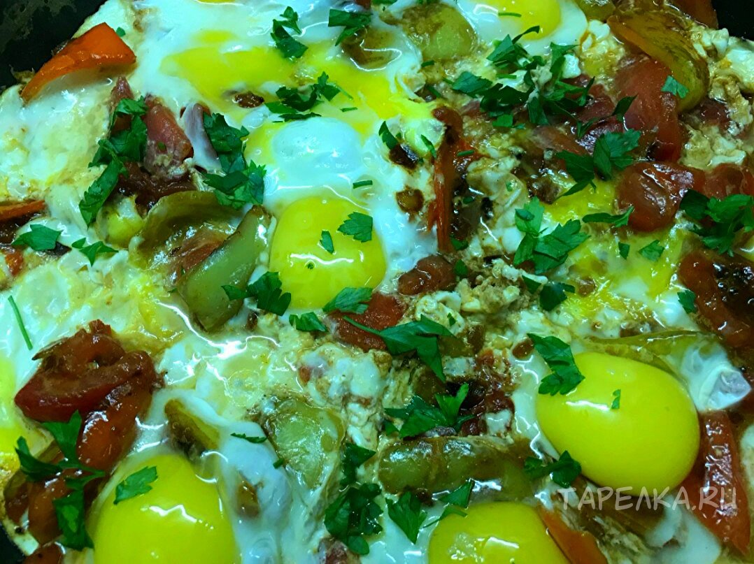 Добро пожаловать на кулинарный канал «Тарелка.ru»! Приветствуем всех постоянных читателей и тех, кто заглянул впервые. Пока сезон овощей, нужно пользоваться моментом. Как можно чаще готовить блюда с овощами. Поэтому сегодня хочу вам предложить приготовить овощную яичницу. Блюдо получится яркое, вкусное и сытное, а готовится очень быстро и просто. Советую обязательно его приготовить, порадовать родных таким замечательным завтраком. А прежде чем я начну, хочу попросить вас подписаться на меня здесь ТАРЕЛКА.RU, а так же в YOUTUBE // INSTAGRAM, там еще больше простых и доступных рецептов на каждый день ПРИГОТОВЛЕНИЕ Ингредиенты я укажу в конце статьи. Первым делом мою и обсушиваю овощи. Лук очищаю и нарезаю не большими кубиками. Болгарский перец очищаю от семян и нарезаю брусочками. Теперь займусь помидорами. Вначале снимаю шкурку с помидоров. Для этого опускаю помидоры в кипящую воду на 10 секунд, а затем охлаждаю помидоры. Теперь легко и просто удаляю шкурку с томатов. Разрезаю помидор