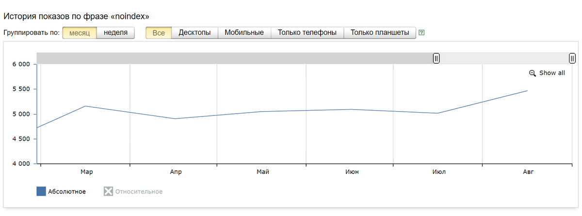 С начала года число запросов о метатеге выросло с 3 до 5 тысяч. Но ищут информацию не только дзен-блогеры, тут ещё много других представителей цифровой экономики. Плюс есть еще тег noindex, придуманный Яндексом для закрытия не всей страницы, а его части. Им тоже интересуется, а разделить запросы нельзя.