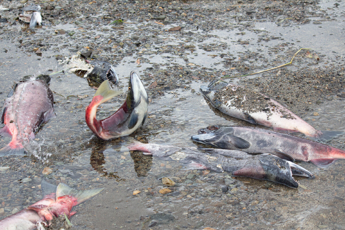 У взрослых рыб ярко видны нерестовые изменения. Их плоть уже разлагается, чтобы стать пищей потомству. Пока ещё живые рыбы мечут икру среди своих уже мёртвых собратьев.