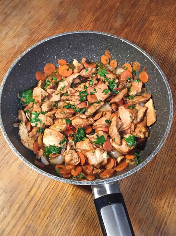3) На разогретую сковороду кидаем курицу, обжариваем до корочки.