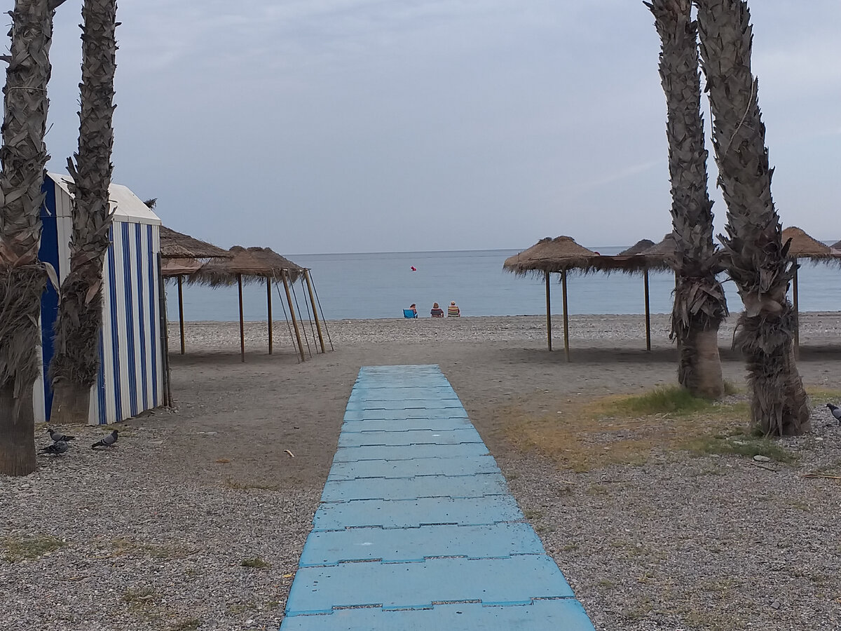 Мы приезжаем в Альмуньекар уже много лет подряд, даже в ветреные и дождливые дни, когда особо не искупаешься, а можно просто побродить по галечно-песчаному пляжу, коснуться волны, перекинуться фразой с парой пожилых датчан или других северян, которых в осенне-зимнюю пору тут - большинство из всех туристов, поглазеть на отельные пальмы и иные приметы курортности. Завтра-послезавтра, после двух-трех дней непогоды, здесь снова станет жарко и туристично: на песке расставят шезлонги, заработает кафе у самой кромки моря. А пока пейзаж почти зимний: пустынный пляж, на котором голубей и чаек больше, чем отдыхающих, но ни первые, ни последние не суются в воду. Лет пять-шесть подряд мы традиционно обедаем в одном и том же недорогом ресторанчике на первой линии. "La tralla" - его название вы легко найдете в TripAdviser или просто в Гугле. Ни официант, камареро, не интересуется моим именем, ни я - его. Однако мы дружим уже полдесятка лет, неизменно встречая друг друга объятиями или (в ковидную эпо
