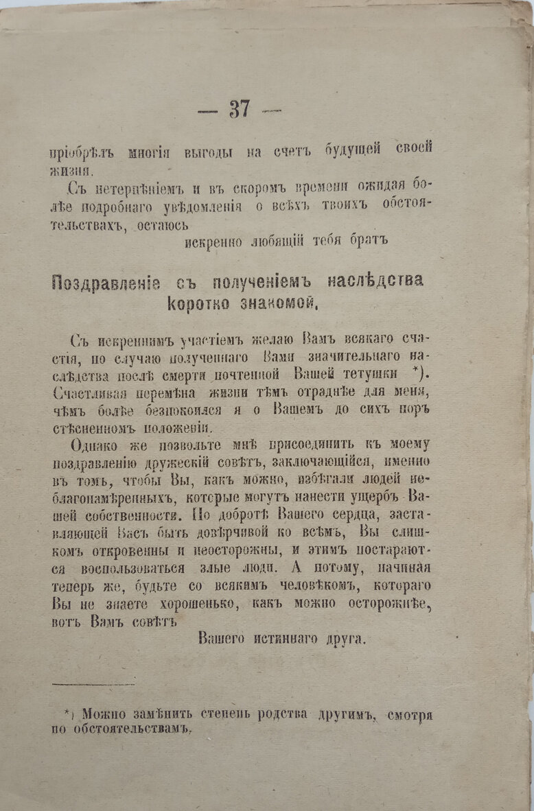 В таком письмовнике содержатся образцы поздравительных и утешительных писем, рекомендации, приглашения, «письма любовные», «содержащие упрек, выговор», «письма рекомендательные», «письма напоминательные», а также ответы на все эти письма.