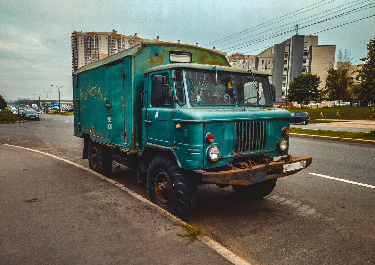 Шёл, шёл, шишигу нашёл. Газ-66 в своём первоначальном исполнении. Аппарат стоит одиноко вдоль дороги, даже номера присутствуют. Колёса не спущенные, машина рабочая. Но если чуть присмотреться к мелочам, можно подумать что заброшена - разбитое лобовое стекло, немного ржавчины на кузове. Хотя кого я обманываю, машине далеко не 10 лет... Прилетел камушек в лобаш, ну чуть коррозия вылезла, хотя трос явно закис и давно не использовался. Впервые вижу в живую оригинальную шишигу, по фоткам в интернете она выглядит намного больше. В живую же, как обычный современный джип. Машина проектировалась как рабочий агрегат, минимум комфорта, максимум работоспособности. Двигатель выходит прямиком в салон, откидываем крышку и ремонтируем на ходу. На приборной панели ничего лишнего, только основные показатели для отслеживания состояния авто. Сложно представить этого зверя в повседневном использовании, топливо жрёт нескончаемо. Но и оправдывает этот троглодит свой аппетит невероятной мощностью, постоя