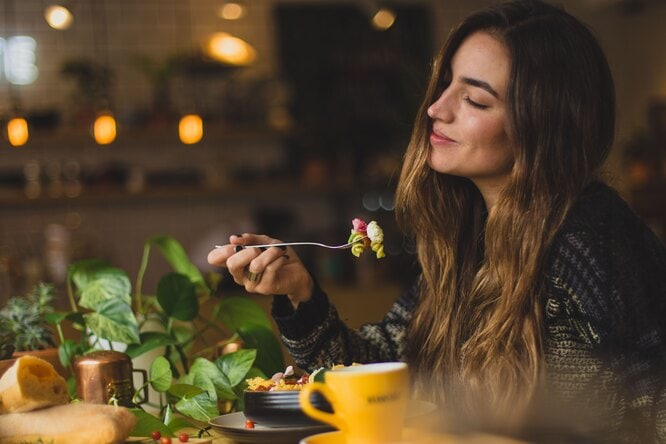 Когда во время приема пищи человек отвлекается на что либо и не обращает внимания на свою порцию еды, он съедает больше. Во время просмотра любимого видео порции увеличиваются, в среднем, на 14%, а при приятном беседовании с приятелями — на 18%. Чтобы ощутить чувство сытости, недостаточно просто поместить еду в желудок, важен сам процесс. Вы должны видеть еду, чувствовать её запах и вкус. Когда вы едите за рулем, во время чтения или разговора с кем-то, мозг занят этими задачами и не получает данных о еде. В результате аппетит сохраняется гораздо дольше. Ешьте в одиночестве, отложите смартфон, выключите телевизор. Сконцентрируйтесь на еде и своих ощущениях от неё, и вы почувствуете насыщение гораздо раньше.