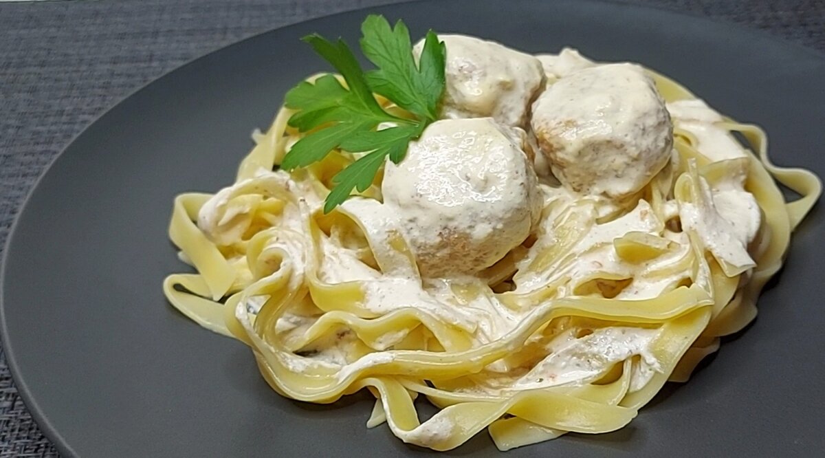 От такого блюда тяжело отказаться, а попробовав его - будешь готовить ещё не раз! Нежные, сочные, со сливочным соусом фрикадельки с пастой тальятелле. Ингредиенты: 1. Филе бедра куриное - 700 гр. 2. Лук - 1 ср.шт. 3. Морковь - 1 ср.шт. 4. Соль, перец чёрный - по вкусу 5. Сливки 20% - 500 мл. 6. Паста - 400 гр. 7. Масло растительное - для жарки. Приготовление: 1. Из филе, лука и моркови приготовить фарш. Перекрутить всё на мясорубке либо в блендере. Посолить и поперчить по вкусу. Хорошо всё перемешать. 2. Сковороду разогреть на среднем огне. Добавить немного растительного масла. Сформировать небольшие шарики из фарша и обжарить их 3 минуты с одной стороны. После фрикадельки перевернуть, накрыть сковороду крышкой и жарить ещё 3 минуты. И так со всем фаршем, если всё сразу не поместится. 3. Затем на чистую сковороду выложить все обжаренные фрикадельки и залить их сливками. После закипания тушить 2-3 минуты. Как только сливки начнут загустевать, посолить по вкусу. По желани