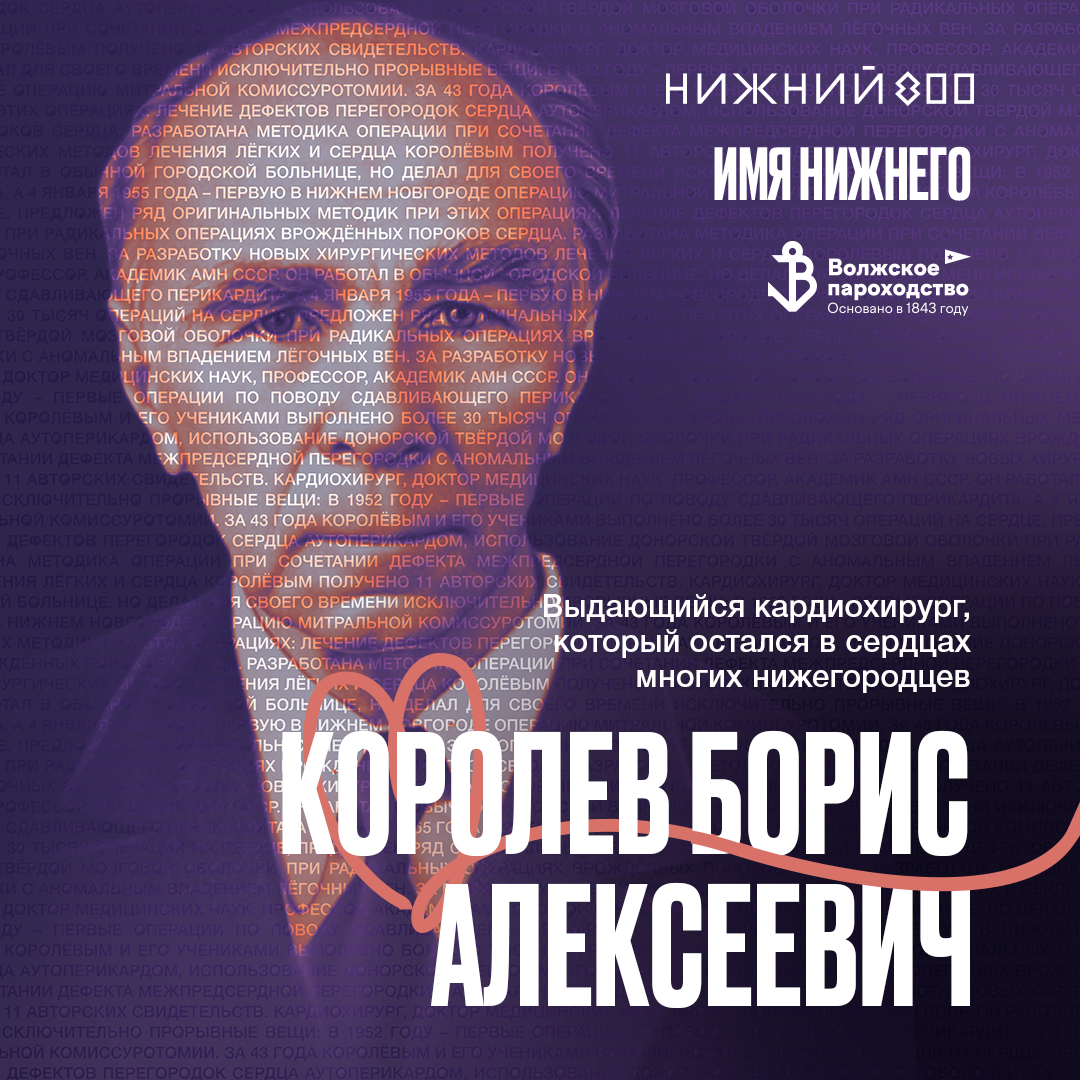 15 202 нижегородца приняли участие в голосовании за «Имя Нижнего» и выбрали девять героев, которые вошли в праздничную программу 800-летия. Проект «Имя Нижнего» организован к 800-летию Нижнего Новгорода «Центром 800», Министерством культуры Нижегородской области и Нижегородским государственным историко-архитектурным музеем-заповедником. Его цель — вдохновить нижегородцев на изучение истории родного города, познакомив со знаковыми историческими и современными личностями. АО «Судоходная компания «Волжское пароходство» присоединилась к проекту: все сотрудники компании, в свою очередь, выбрали одного из девяти героев, чье имя будет присвоено новому судну. Этим героем стал кардиохирург Борис Алексеевич Королёв — врач, который остался в сердцах многих нижегородцев. За 70 лет в медицине Борисом Алексеевичем вместе с коллегами и учениками было сделано: 57 000 операций на органах брюшной полости, 11 000 операций на лёгких, 30 000 операций на сердце. Имя нижегородского кардиохирурга будет носит