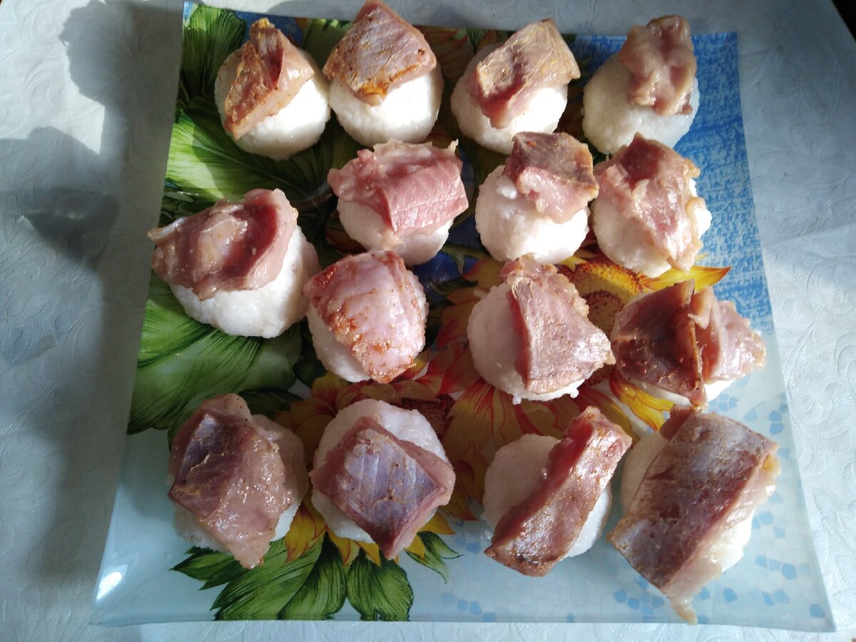Иногда у любой хозяйки возникает вопрос "Что готовить?" Суп -надоел, каши - приелись, выпечка - долго. Хочется чего нибудь новенького, неординарного. И тут приходят на ум различные рецепты, которые мы обычно сами не готовим, а заказываем в кафе, ресторанах, или суши-барах. Повторить все национальные тонкости некоторых блюд в простых домашних условиях, порой не имеет никакой возможности, а вот что-то подобное иногда приятно удивляет всю семью. Вот сегодня что то отдаленное национальной японской кухни, под названием суши мы приготовим для всей семьи. Для рисовых шариков нам понадобиться Для начала рис нужно очень хорошо промыть, раз 5 - 7 точно, пока вода не станет прозрачной. Затем заливаете рис водой и ставите на огонь, после закипания делаем температуру умеренной и варим минут 15, желательно помешивать, чтоб рис не прилипал к кастрюле. Как только рис приготовился оставляем его в кастрюле под плотно закрытой крышкой, чтоб рис впитал в себя всю влагу. В ковшик наливаем рисовый уксус