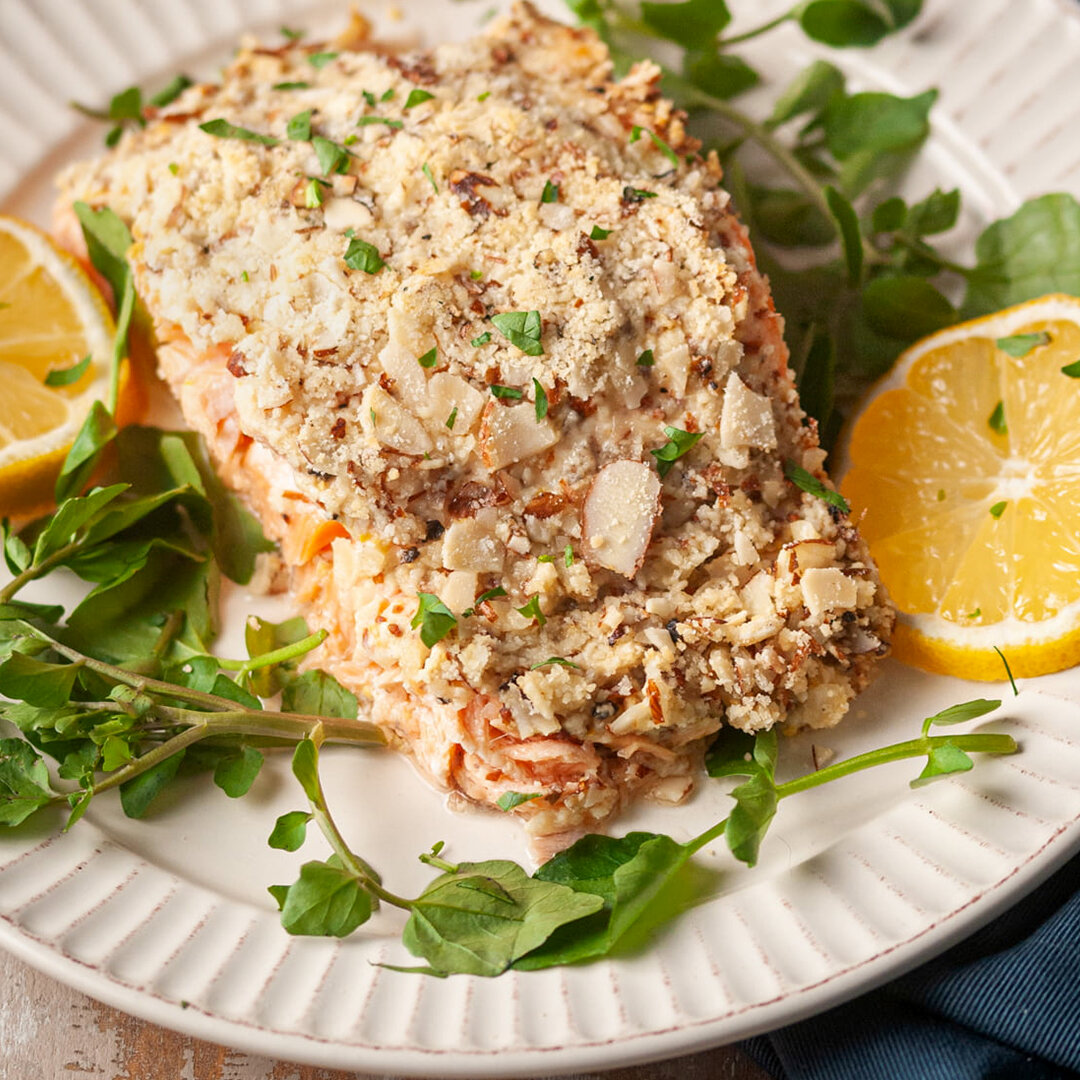 Нежный внутри, хрустящий снаружи, с ярким ароматом лимонного сока, дижонской горчицы и сыра... 🤤 Этот лосось можно приготовить на ужин в кругу семьи и даже на праздничный стол! Несмотря на свою красоту и неординарность, блюдо готовится довольно быстро и просто. ИНГРЕДИЕНТЫ: 🔸Лосось - 400-500 г 🔸Дижонская горчица - 50 г 🔸Измельченный миндаль - 80 г 🔸Пармезан - 100 г 🔸Сок 1/2 лимона 🔸 Соль, перец - по вкусу 1. Разогрейте мини-печь до 200 °C. 2. После того, как рыба высохнет, добавьте маринад из лимонного сока и дижонской горчицы. Это покрытие будет действовать как усилитель вкуса и липкое связующее, помогая корке прилипнуть к рыбе. Взбейте вместе лимонный сок и дижонскую горчицу, затем ложкой или кистью для запекания нанесите тонкий ровный слой поверх лосося. 3. Добавьте измельченный миндаль, пармезан, соль и перец в небольшую миску и перемешайте, чтобы образовалась корочка. Затем чистыми руками вдавите корочку в лосось тонким слоем. 4. Полностью накройте форму для запекания фоль