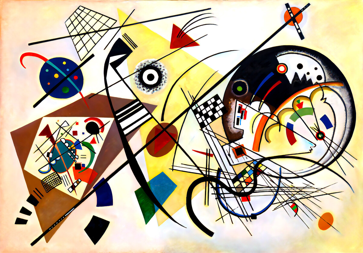 Другим видным теоретиком авангарда был Василий Кандинский. В его произведениях все представлено в виде первичных элементов. Изображение состоит из линий, точек разных цветов, которые образуют захватывающую воображение композицию. Он как бы отправляет нас во времена сотворения мира, когда все состояло из простейших элементов.