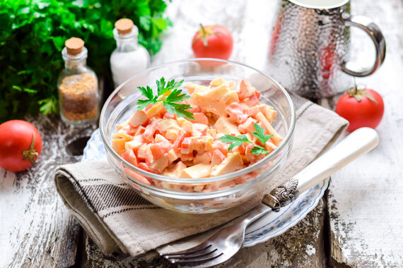 Салат с крабовыми палочками и помидорами - классический рецепт