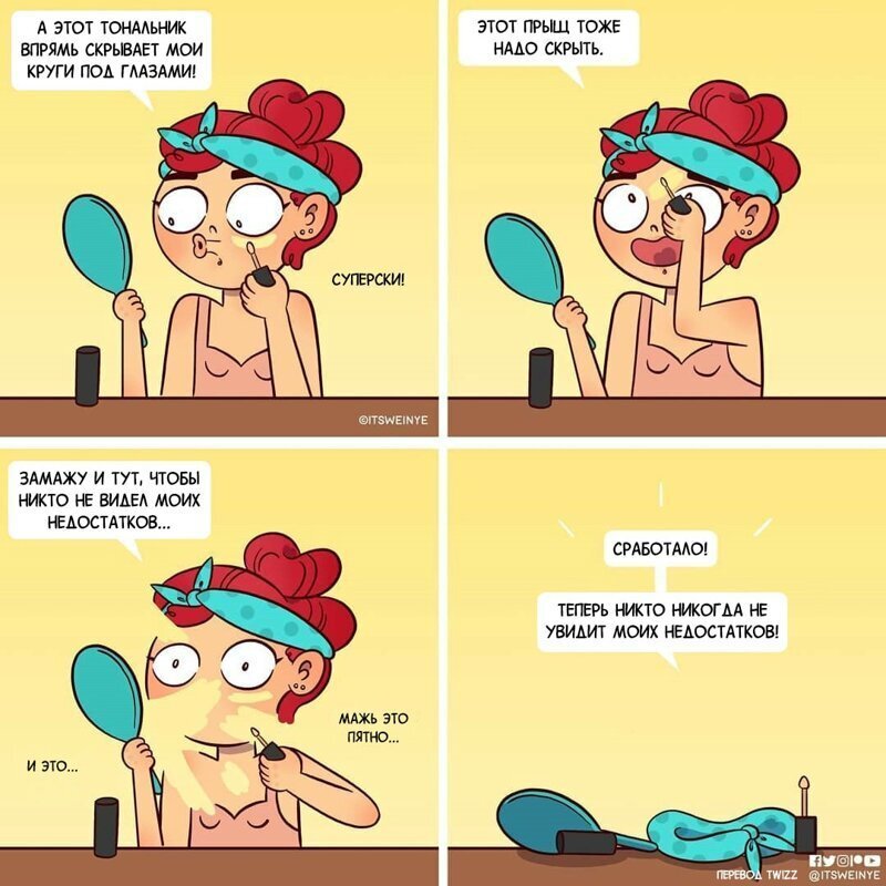 Привет, дорогой друг! Я знаю несколько хороших способов, которые помогут преодолеть осеннюю хандру. Первый — это витамины, ведь, как мы знаем, осенью и весной наш организм в них особенно нуждается, а второй — это новая подборка забавных комиксов на моем канале. Сегодня я собрал для тебя #комиксы , которые нарисовали художницы-девушки. Все они будут посвящены проблемам, которые периодически проявляются в жизни прекрасной половины человечества. Думаю, хотя бы в одном из них ты точно узнаешь себя, либо свою подругу или знакомую. Чтобы выглядеть привлекательнее, многие #девушки уделяют большое внимание попыткам скрыть даже самые маленькие недостатки своего лица, тела, фигуры. Однако, со средствами для коррекции можно легко переборщить и в итоге превратить себя в другого человека или создать ситуацию как в комиксе от It’s Weinye. Если в твоей жизни никогда не было невыполненных обещаний, которые ты сам себе давал («начну заниматься спортом с понедельника» или «эта серия точно последняя»), т