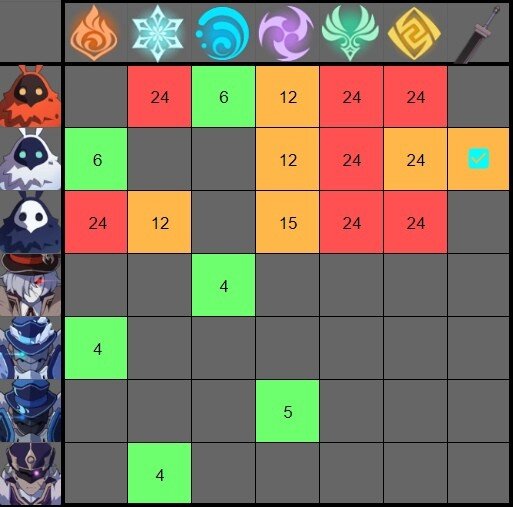 Сила наложения элементов всех персонажей Полная таблица уязвимостей монстров