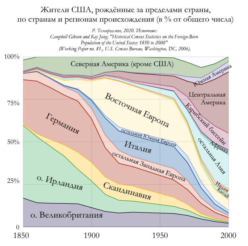 Графики показывают долю разных стран и регионов мира (1) в общей численности рожденных за пределами США (т.н. Foreign-born population) и абсолютную численность выходцев из них (2) с 1850 по 2000 годы. Графики составлены по изданию Campbell Gibson and Kay Jung, "Historical Census Statistics on the Foreign-Born Population of the United States: 1850 to 2000". Отправная точка - 1850 год. В этот момент - за одно десятилетие до гражданской войны - почти половина иммигрантов в США представляла Ирландию. Это последствия печально известного ирландского "картофельного" голода 1845-1849 годов. Огромный по масштабам приток католического ирландского населения, значительная часть которого плохо владела английским, стал большим испытанием для прежде почти исключительно протестантской Америки. Как в находившейся "под боком" Великобритании, как в далеких Австралии, Новой Зеландии, Канаде, так и в США ирландцы первоначально селились в основном в крупных городах атлантического побережья - Нью-Йорке, Бос