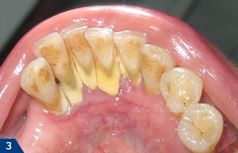 Дома, при помощи зубной щетки и пасты – можно успешно удалять с зубов только мягкий зубной налет (рис.1). Однако, если последний вовремя не счищается, то он постепенно пропитывается солями кальция, содержащимися в слюне. В результате процесса минерализации мягкий микробный налет превращается в зубной камень (рис.2-3), который можно снять только у стоматолога.