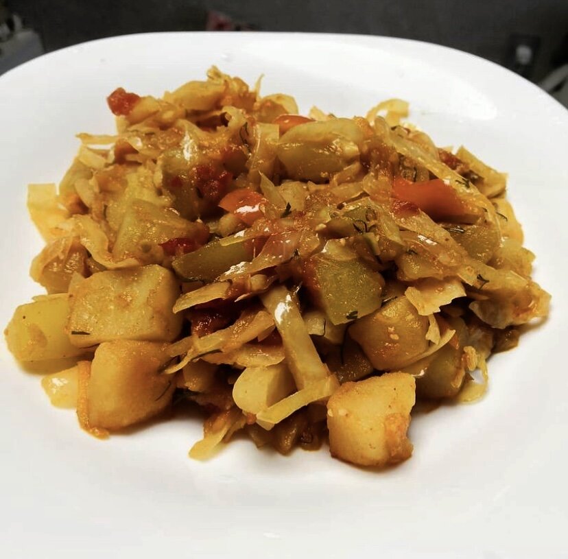Ингредиенты все на глаз, сколько влезет кастрюлю. Масло растительное 4 ст л Лук репчатый 1 шт крупный Морковь 2 шт Перец болгарский 2 шт Картофель свежий не крупный 4 шт Кабачок 400 гр Капуста белокочанная половинка небольшого вилка Чеснок 2-3 зубчика Помидор 1-2 шт Соль щепотка Чеснок сушеный 1 ч л Паприка сладкая 1 ч л Укроп сушеный щепотка Овощи заранее помыть и почистить. Для рагу овощи нарезаем кубиками, капусту соломкой. Закладывать овощи последовательно, по мере нарезки. Готовил в казане ( подойдёт глубокая кастрюля) Разогреть масло, обжарить лук с чесноком, добавляем морковь перемешать, потом перец болгарский, картофель, кабачек, капусту. Каждый слой перемешиваем. Посолить. Перемешать, дать потушиться минут 10 под крышкой. Как овощи уменьшаться в объёме добавляем резаные помидоры (без кожи). Перемешать. Добавить специи. Перемешать тушим минут 5 мин. Пробуем на готовность картофеля и капусты. Как капуста станет мягкой, а картофель будет готов снимаем с огня. Дать настояться 10