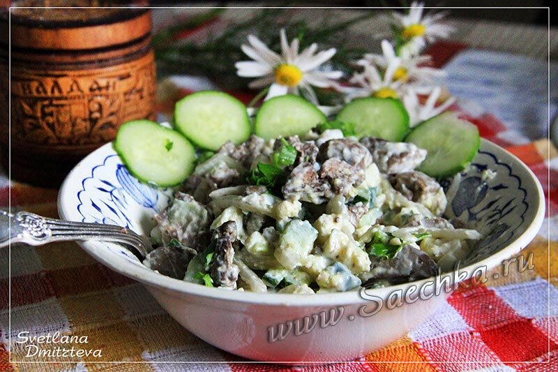 Кухня СССР. Существует версия, что в шестидесятых это блюдо активно продвигали в вагонах-ресторанах. Кроме воспоминаний отдельных железнодорожников других доказательств этому найти не удалось. Готовился салат «Пассажирский» из трёх ингредиентов: говяжьей печени, жареного лука и солёного огурца. Ну а заправлялся, как и положено, майонезом. Годы идут... И говяжью печень заменили на куриную, лук не обжаривают, а маринуют, солёный огурец заменили свежим (хотя зимой можно приготовить с маринованным), добавили яйцо и только майонез остался неизменным. Впрочем, майонез теперь домашнего приготовления. Ингредиенты: Как приготовить: P.S.: Вот с виду неказистый салат, но вкусный и сытный.