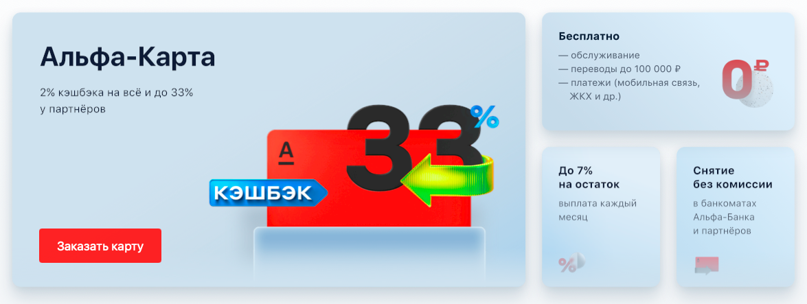 При оформлении бесплатной дебетовой карты Альфа-Банк по ссылке вы получаете 500 рублей на счет. Карта оформляется за 2 минуты онлайн. Можно выбрать платежную систему: VISA или MasterCard. Условия максимально привлекательные. Кроме того, при оформлении кредитной карты 100 дней без процентов на все сейчас по ссылке вы получите скидку 900 ₽ на обслуживание: 590 рублей вместо 1490 в год!
