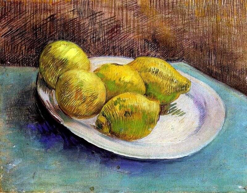 В Париже Ван Гог направляет свои усилия на эксперименты с цветом, пытаясь сделать свою палитру более чистой и яркой. Проще всего было реализовать эту идею, изображая цветы и фрукты, поскольку их тонкие природные оттенки заставляют внимательно относиться к выбираемым краскам, избегать глухих темных участков и стремится к чистоте цвета. Ван Гог делает акцент на сочетании контрастных цветов скатерти и лимонов, хотя здесь оно не является таким ярким, как в некоторых других натюрмортах парижского периода. Возможно, картина писалась при искусственном освещении, поэтому в светлых частях преобладают теплые оттенки, которые контрастируют с яркими холодными цветами теней. Темный коричневый фон визуально ограничивает композицию, позволяя сконцентрировать взгляд на ярко-желтых лимонах. Ван Гог уделил мало внимания правильности форм. Объемы моделируются энергичными штриховыми мазками. Эта небольшая картина писалась как быстрый этюд, целью которого было схватить и передать цветовые соотношения предм
