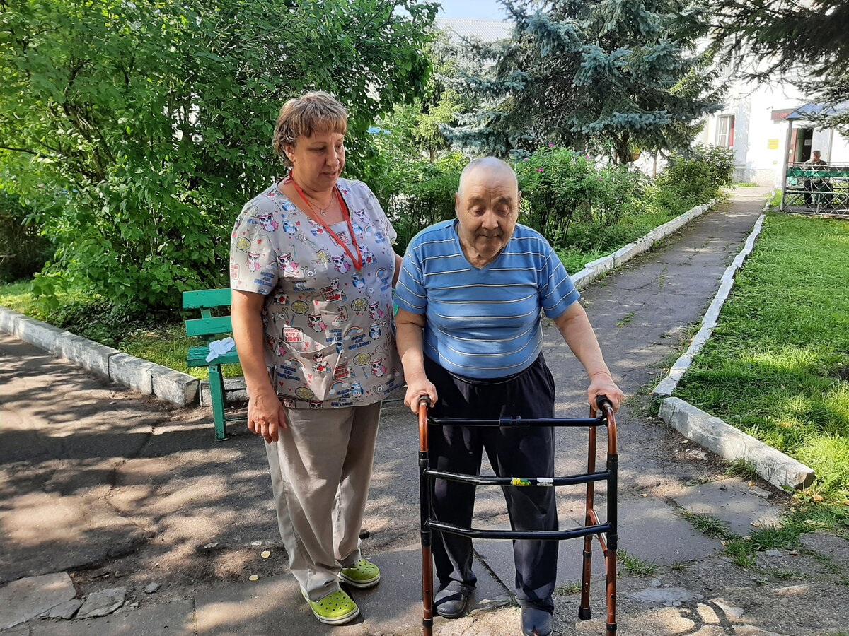 Николай Петрович из Вяземского интерната в Смоленской области делает свои первые шаги без ходунков. До того он несколько лет был уверен, что инвалидное кресло – его «последняя гавань». Но помощники по уходу и культорги от фонда «Старость в радость» в Вяземском интернате знают: коляска – не всегда приговор. Вместе с медиками они замечают тех пожилых людей, кто оказался «сидячим» (а иногда и лежачим), но имеет потенциал реабилитации и может встать на ноги, и начинают с ними заниматься. Несложный массаж, велотренажеры и другие посильные упражнения в помощь. Главное – регулярность тренировок. Уже не раз они помогали оставить коляску тем, кто слег из-за недостаточности ухода, или не мог разработать ногу, сросшуюся после перелома. Сейчас в Вяземском интернате учатся ходить сразу несколько человек. Особенно отличился Николай Петрович: в холл он может ходить теперь даже без ходунков! Конечно, сотрудники для подстраховки идут рядом, а на улицу берут с собой даже коляску, чтобы в любой момент мо