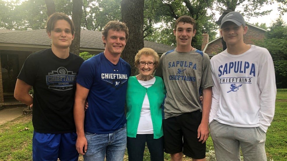 For 58 years, Oklahoma resident Catherine Ritchie has lived in the same home in the Tulsa suburb of Sapulpa. That all changed three weeks ago. She said she was in the bathroom getting ready for bed when she turned around and saw the head of her bed was on fire, KTUL reports. That's where her heroes came in. Four boys between the ages of 14 and 17 in a nearby home went outside to leave for a convenience store, and then they noticed the smell. "It smelled kind of like burning rubber," 16-year-old Dylan Wick told the Tulsa ABC station. "Then we heard the house alarm go off." BEST HOOKUP SITE TO GET STRAIGHT TO BUSSINESS Catherine was still inside trying to put the fire. But she quickly gave up, called 911 and hit her emergency call button. Then came another problem. "The smoke was so bad, I couldn't see to get out of my room," she said. "I felt along the wall, and I went into the closet instead of the door to get out of the room. I finally did get to the door." While trying to feel her wa