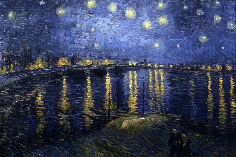 Данное полотно была написана Винсентом Ван Гогом в 1889 году, он писал эту картину целый год. Работа выполнена крупными и объемными мазками, это излюбленная техника художника. “Звездная ночь над Роной” выполнена в темных, в основном синих, цветах, переходящих в сотни различных оттенков и сочетаясь с желто-золотым цветом звезд и огней города.