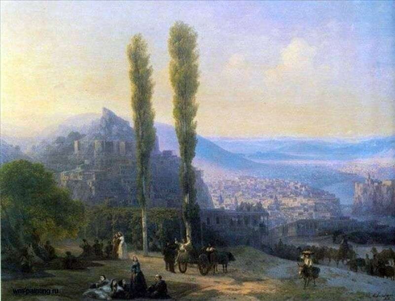 “Вид Тифлиса” – один из пейзажей Айвазовского, написанного в 1869 году. На картине изображен южный город Тифлис с уникальной для него природой. На горизонте можно увидеть прекрасные величественные горы, создающие в пейзаже особый колорит. Небо торжественно и грандиозно, оно будто сливается с силуэтом гор. Здесь преобладают насыщенно-зеленые и золотисто-желтые оттенки. Картина представляет собой городской пейзаж, и вдали виднеются очертания знаний. Благодаря этому мы можем представить, как выглядел Тифлис во время написания картины. Грандиозные горы, сочная зелень – все это характерно для природы Тифлиса, которая проживает особую жизнь. Человек находится в полном единении с природой, которую можно ощутить глядя на этот пейзаж. Детали в картине очень важны, они подчеркивают грандиозность этой повседневной картины. Художник передает свое отношение к увиденной им природе. Картина словно излучает особое свечение.