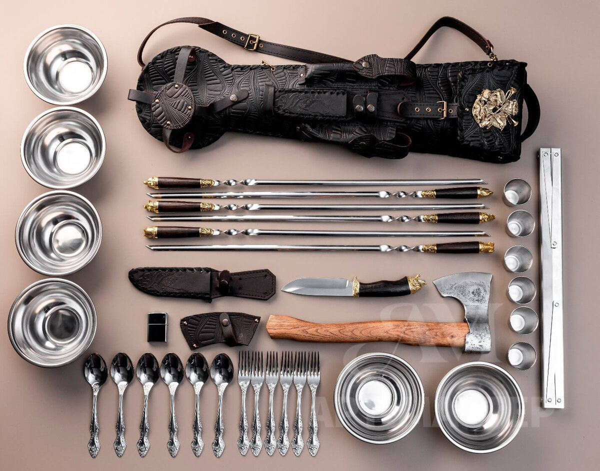 Мучаетесь в поисках по-настоящему крутого подарка для любителя отдыха на природе, или человека, увлеченного охотой, рыбалкой, туристическими походами? Хотите выбрать лучшее? Походный набор «Викинг» в подарочном исполнении – идеальное решение вашей проблемы! Путь к достойному подарку бывает непрост. Лабиринты торговых рядов, бесконечные вкладки онлайн-подборок, мучительная неопределенность. Что подарить? Что же подарить?? Выбрав походный набор «Викинг», вы сможете с гордостью вручить достойную вещь, которая годами будет радовать счастливого владельца. Каждый раз, доставая набор, он будет с теплотой вспоминать дарителя и сам миг вручения ТАКОГО подарка! «Викинг» — это качество, стиль и практичность! Походный набор «Викинг» идеально сбалансирован для отдыха на природе. Шампуры, мангал, столовые приборы, походная посуда, нож и топор надежно упакованы в превосходный кожаный чехол. Набор рассчитан на компанию из 6 персон, которые теперь точно станут поклонниками эстетичной походной кухни. В