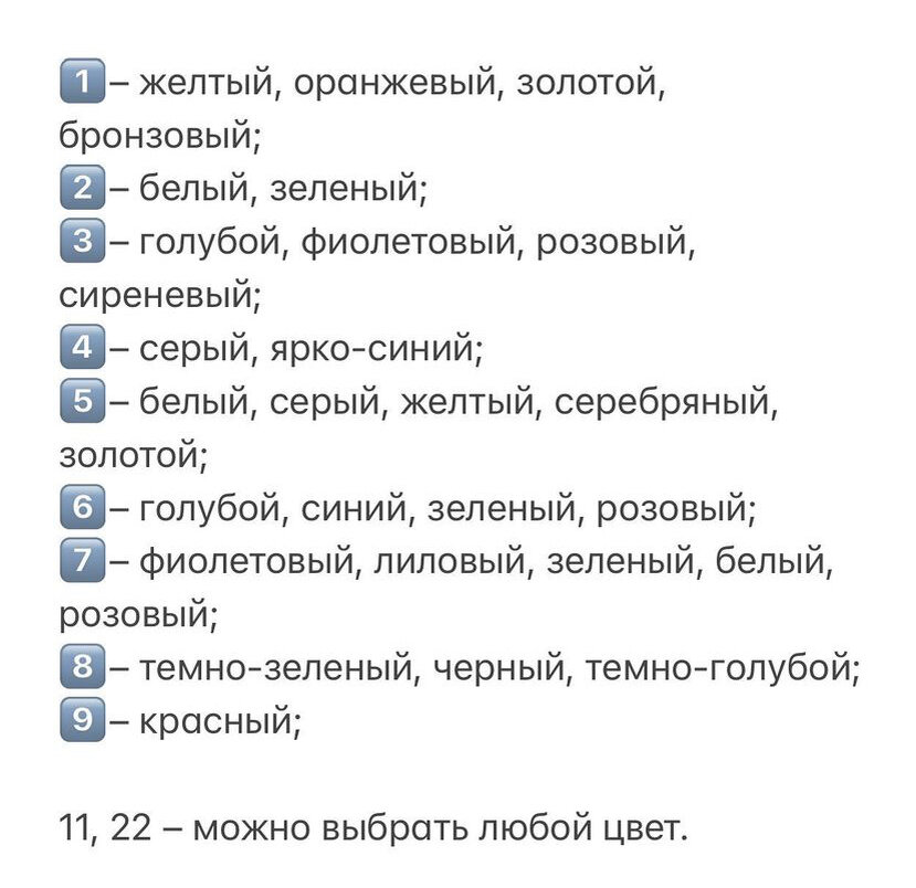 Мы все рождаемся в определенный день. Число этого может быть разным: однозначным, двузначным либо число 11 или 22. Надо отметить, что числа 11 и 22 – это так называемые мажоритарные числа, и для них существуют свои правила. Но если вы родились в другой день, то нужно произвести некоторые подсчеты. Предположим, вы родились 9 числа. Следовательно, код вашего дня рождения – 9. Если 1 числа, то – 1. Далее, если вы родились в любой день, определяемый двузначным числом, то вам нужно из большей цифры вычесть меньшую. Например: – Вы родились 25 числа. Из 5 вычитаем 2. Код дня рождения равен 3. – Вы родились 31 числа. Из 3 вычитаем 1. Код дня рождения равен 2. – Вы родились 10, 20, 30 числа. Код дня рождения равен соответственно 1, 2 и 3. Теперь, когда вы определились с кодовым числом вашего дня рождения, назовем цвета, привлекающие денежную энергию, в соответствии с полученным кодом. Расшифровку кодового числа смотрите в ФОТО В соответствии с этим данными вы и можете не только выбра