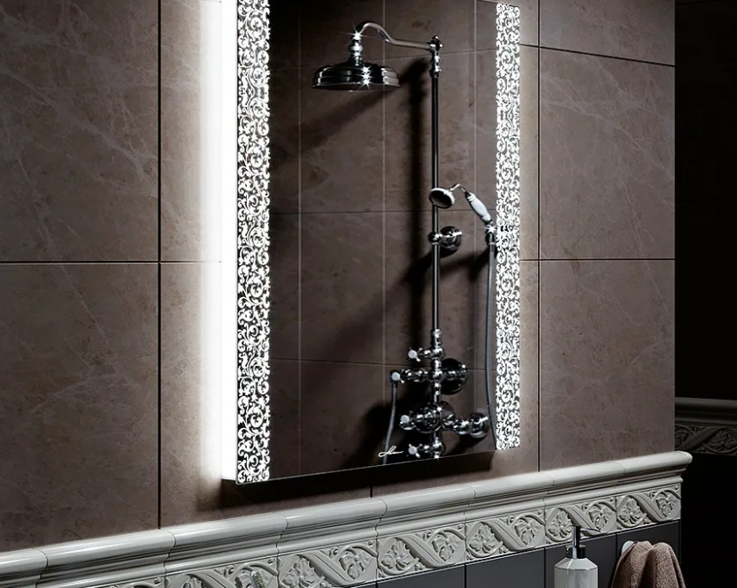 Долгие годы в наших ванных комнатах было только одно зеркало – над умывальником. Сегодня в интерьере прослеживается тенденция к «озеркаливанию» стен, полочек, шкафчиков и дверей. Если размеры ванной комнаты позволяют организовать туалетный столик для модницы, только на нем одном должно быть, по меньшей мере, три зеркала: основное – большое и хорошо освещенное, в нем можно увидеть себя как минимум до пояса зеркало для макияжа – с увеличивающим эффектом и тоже хорошо освещенное ручное или переносное на подставке.