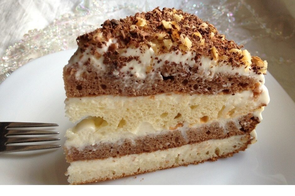 17. Последним укладываем белый корж, также прокалываем его вилкой с обеих сторон.