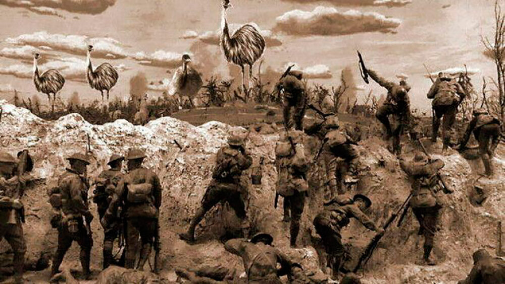Летом 1932 года стада эму, ежегодно мигрирующие к побережью, начали угрожать посевам в Западной Австралии. В самих миграциях не было ничего странного, но на этот раз их масштабы были огромными - количество птиц доходило до 20 000 особей, и фермеры обратились за военной помощью. Правительство отправило для борьбы с «чумой» трех солдат, вооруженных пулеметами, и съемочную группу, которая должна была запечатлеть «подвиг» австралийской армии. Дополнительной мотивацией стала возможность потренироваться в стрельбе по сверхбыстрым целям (скорость эму достигает 50 км/ч).