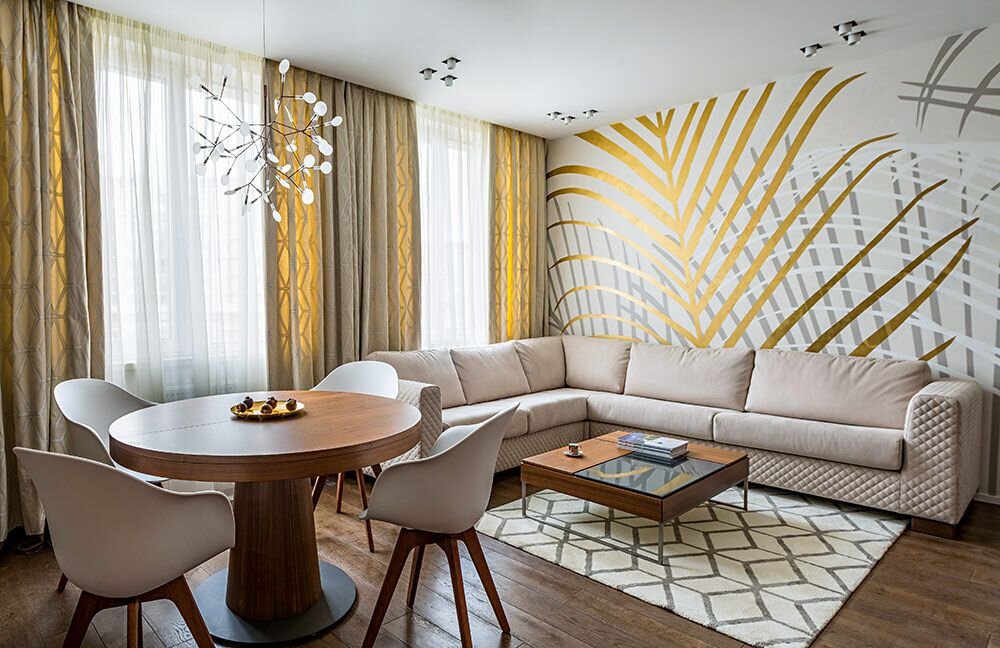 В первоначальном варианте данная жилплощадь представляла собой трехкомнатную квартиру. И хотя кардинальных изменений при перепланировке автору проекта удалось избежать, тем не менее, сместив некоторые перегородки и объединив гостиную и кухню, он получил пространство с тремя спальнями вместо двух. Заказчики хотели, чтобы интерьер был легким, отчасти минималистичным, светлым, и автор проекта построила его на классическом сочетании белого и коричневого оттенков, а одну из главных ролей отвела зеркалам. Например, в холле целая стена декорирована зеркальным панно, что визуально сделало входную зону шире и светлее. В общественном пространстве кухня совсем не ассоциируется со своим сугубо утилитарным назначением, а скорее воспринимается как система хранения. Фасады двухуровневых подвесных шкафов — глянцевые, напольные секции выполнены под цвет инженерной доски, поэтому интерьер смотрится целостным. Пол в прихожей выложен крупноформатным керлитом, поверхность которого имитирует штукатурку. Пот