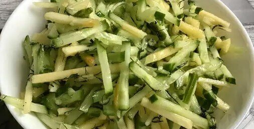 Витаминный овощной салат со свежими огурцами будет отличным дополнением к питательному сезонному меню. Овощи отлично сочетаются с кисло-сладкими яблоками, зеленью и сытным сыром. Для заправки этого салата можно выбрать любой закусочный соус, майонез и даже сметану.