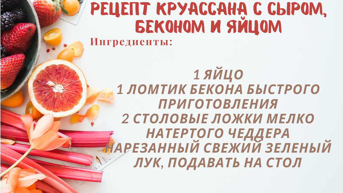 Классическое слоеное тесто с беконом и яйцами. Это просто, и это гарантированно сделает ваше утро незабываемым. Ингредиенты: на 1 круассан 1 яйцо 1 ломтик бекона быстрого приготовления 2 столовые ложки мелко натертого чеддера Нарезанный свежий зеленый лук Приготовление: