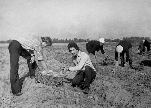 Руководство Советского Союза, пытаясь поднять сельское хозяйство с помощью командно-административных методов, на деле постоянно ухудшала положение с производством сельхозпродукции. Одним из методов, которыми пытались увеличить сборы урожая, стала так называемая "поездка на картошку". Поездка на картошку - обобщенное название массового вывоза из города учащихся институтов и работников многочисленных НИИ в колхозы и совхозы для уборки урожая, практиковавшегося в 1960-80-х годах в СССР. Причем это могла быть и не картошка - а например капуста, свекла или морковка. Но суть была одинаковая - в колхозах массово использовалась практически бесплатная рабочая сила. Студенты проводили в колхозах целый сентябрь, госслужащие и работники научно-исследовательских институтов отправлялись на битву за урожай как правило на несколько осенних дней. Поскольку все люди в СССР можно сказать были крепостными, то отвертеться от этой повинности было нельзя - за это следовало наказание. Если ты студент,
