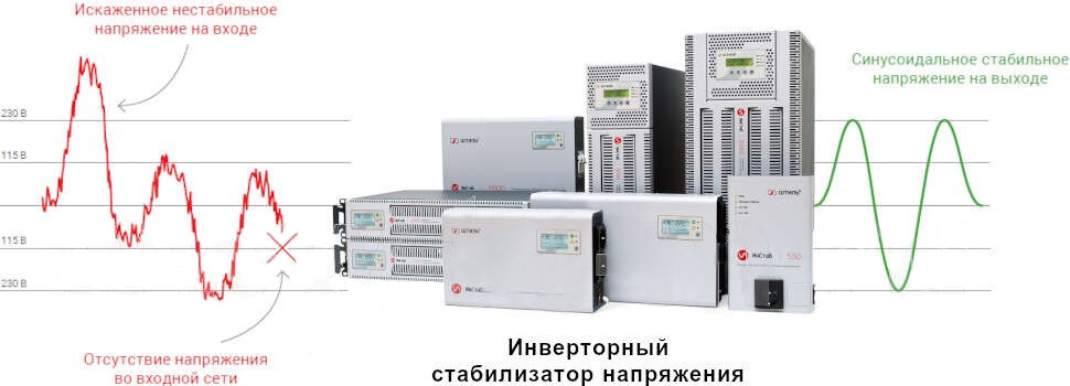 Точность и регулировка входного напряжения происходит автоматически и мгновенно, диапазон рабочих напряжений очень широкий, постоянные 220 В инверторные приборы будут выдавать даже при очень значительных отклонениях входного напряжения от номинально заявленной величины, при этом погрешность будет не больше 1%, а формой выходного напряжения будет чистый синус. Компактные размеры, отсутствие в конструктиве трансформатора и других подвижных элементов, принципиально иной принцип функционирования, всё это заслужено выводит инверторные стабилизаторы в лидеры рынка данного типа товаров.