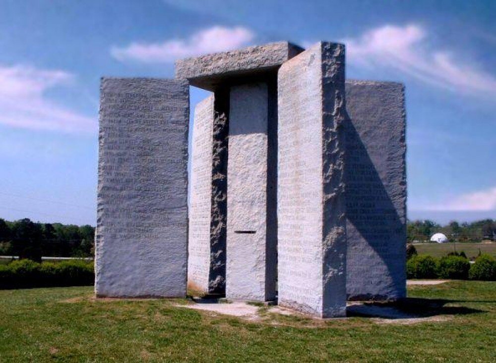 Кто же эти «они», которые лезут уже и в душу? На снимке, что в начале статьи, сооружение, которое называется «Скрижали Джорджии». Возведены они в Америке ещё в 1980 году. Там десять заповедей тех, кто считает себя хозяевами мира, высеченных в камне на разных языках. Первая из них гласит: на Земле нас должно проживать не более 500 миллионов. СССР ещё силён, а сатанисты уже открыто (в камне!) декларировали свои планы. Люди воспринимали «скрижали» как чьё-то чудачество. Но для невидимых тогда живодёров сооружение являет собой воплощение материальной связи между тайными обществами, мировой финансовой элитой и идеями Нового мирового порядка. Как бы портал между видимым и невидимым. И невидимое стало реальностью, материализованным видимым!