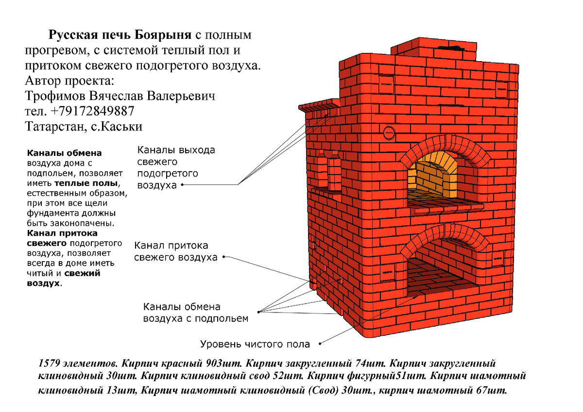 Невозможно представить себе избу в российской деревне без русской печи, которую без преувеличения можно назвать душей любого русского дома. Приготовить, обогреть избу, помыться, затеять стирку, выспаться на теплушке, оставить до утра теплые щи – все это русская печка, которая не только вошла в поговорки и сказки, но и остаётся востребованной до сих пор. Русская печь "Боярыня" в отличие от классической печи имеет прогрев низа печи, за счет дополнительных дымооборотных каналов, причем без дополнительного подтопка. При помощи системы задвижек, печь может работать в классическом режиме, например летом, когда не нужен полный прогрев., а зимой получать более высоки КПД от сжигания дров. Печь имеет каналы обмена воздухом с подпольем, это позволяет иметь теплые полы естественным образом, при этом фундамент должен быть герметичен с внешней средой. Печь имеет канал притока свежего подогретого воздуха. И канал вытяжки для самовара. Размер печи в плане 1525см х 1520см. Сама Печь и труба это п