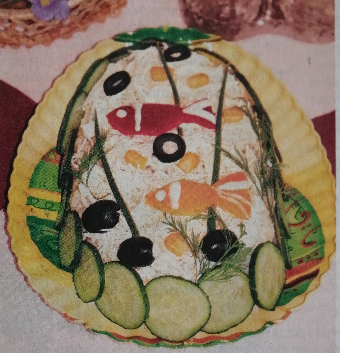 Нам понадобится 300 г филе копченой горбуши *3 вареных карто- феля 4 вареных яйца •2 свежих огурца • 2 болгарских перца (разных цветов) • 1 стакан консерви- рованной кукурузы 300 г майонеза •соль, перец по вкусу Для украшения: 1 крупный свежий огурец 5 - 6 маслин без косточек •3 - 4 пера зеленого лука 3 - 4 веточки укропа Готовим так: 1. Рыбу, картофель, огурцы и перец режем кубиками (по ломтику пер- ца оставляем), белки отделяем от желтков, по отдельности трем на терке. 2. Салат выкладываем слоями: картофель, рыба, перец, огурцы, куку- руза (немного оставляем), желтки. Слои солим и перчим, промазываем майонезом. 3. Сверху посыпаем тертыми белками, края салата выкладываем кружками нарезанного огурца. Украшаем «рыбками», вырезанными из оставшегося перца, кукурузой, маслинами, зеленым луком и укропом Приятного аппетита!!! o