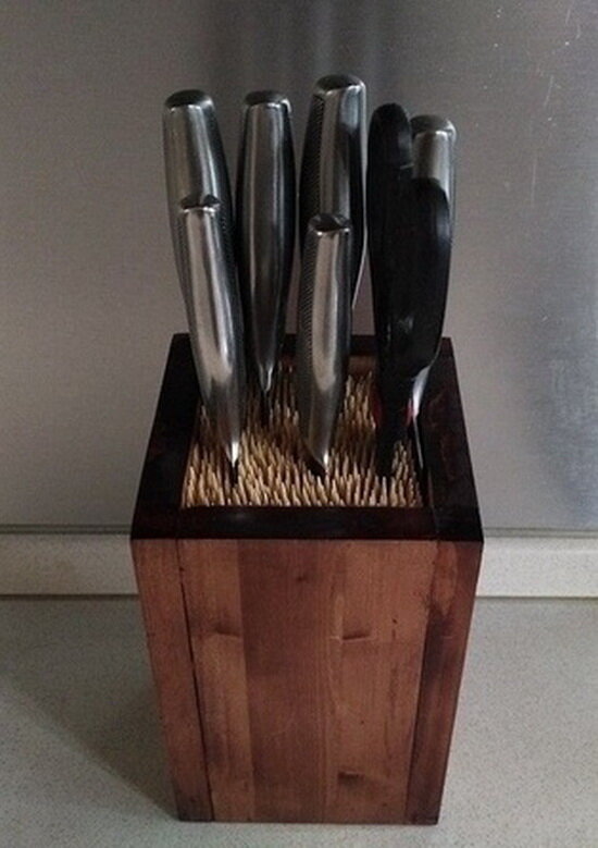Делаем полезную вещь для дома - стойку для кухонных ножей. И так, приступаем к работе. Изготавливаем корпус из доски, предварительно отпилив соответствующие заготовки. Стягиваем детали при помощи саморезов по дереву. Наносим морилку и покрываем лаком. Середину конструкции заполняем деревянными шпажками. Перед применением.) Вот такая класкная стойка получилась у нас. Все довольно просто и каждый сможет сделать эту самоделку для дома. Спасибо за внимание. Удачи!🍀👍🏻