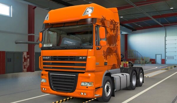 Открывает рейтинг лучших грузовиков в ETS2 — DAF XF 105, грузовик из Нидерландов (г. Эйндховен). Неплохой тягач за €120 500 с классическим дизайном кабины. Все топовые агрегаты открываются на 16 уровне, и, естественно, для этого понадобится еще по меньше мере €100 000 (отдельно можно отметить шасси 4х2 EXTRA TANK 1500 л) и около €50 000 на внешний тюнинг. DAF XF 105 разгоняется до 145 км/ч, это очень хороший показатель, но не лучший (разгон тоже не самый быстрый из-за посредственного ДВС). Дорогу держит уверенно, но уже на скорости 125 км/ч есть риск опрокинуться на бок при резком маневре или повороте.