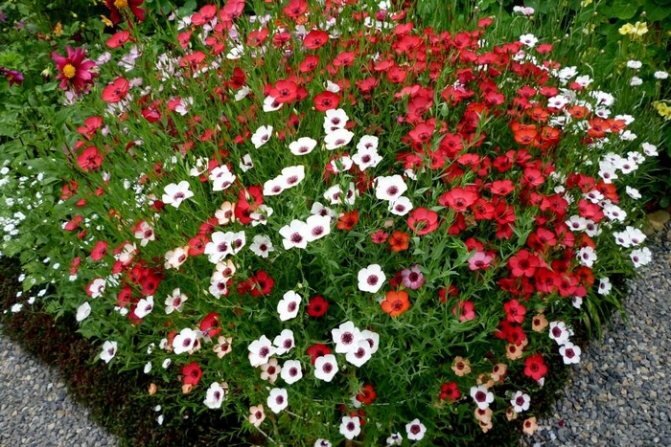 Если вы хотите разнообразить свои цветники чем-то интересным, ярким и не требующим сложного ухода, обратите внимание на многолетний лен. Это очень красивое растение, и, вопреки распространенному мнению, его цветки совсем необязательно должны быть окрашены в голубой цвет. Многолетний лен относится к травянистым растениям и представляет собой не слишком высокие (35-50 см) кустики с тонкими упругими побегами. А вот цветки могут быть разного размера, от совсем мелких до достаточно крупных, и иметь самые разные оттенки обычно белые, голубые и красные. Кроме того, цветки бывают и двухцветными. Лен нельзя отнести к прихотливым растениям, так что в умеренном климате он чувствует себя прекрасно, быстро растет и красиво цветет до самой осени. Если обеспечить льну хорошие условия, то он может расти на одном месте несколько лет, ничуть не теряя своей декоративности. Если говорить о разновидностях, то наиболее интересно, на мой взгляд, выглядит лен крупноцветковый, название которого говорит само
