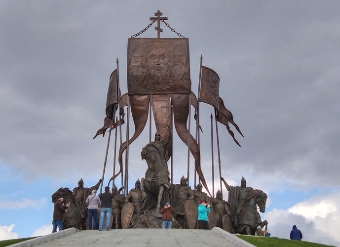 Для меня этот памятник, в первую очередь, памятник Христианству. Бронзовый Невский поднял над головой христианский крест, над войском молодого, прекрасного полководца реют христианские знамёна и хоругви. Прочь, с пути, басурмане, не будите спящего, русского медведя, а будет вам новое ледовое побоище. Немного наивно, правда? Но автора статьи не смущают ухмылки недоброжелателей Великого Александра Невского, потому что автор статьи получил колоссальное удовольствие от поездки в Самолву, и новый памятник автору понравился.