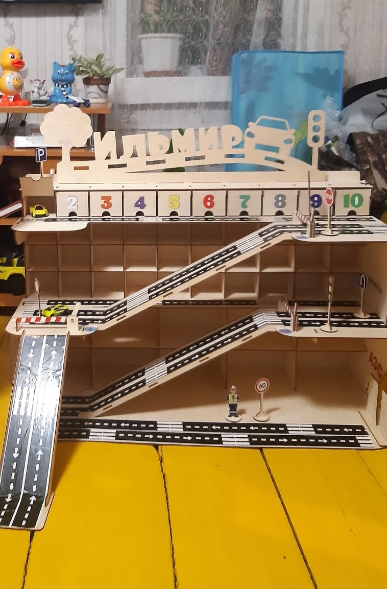 Всем привет, в нашем современном мире много игрушек, много всего интересного для детей. Вот буквально на днях сын увидел в интернете парковку, и начал выпрашивать у меня купить его. Но я конечно подумал, зачем его покупать если я и сам могу, сделать так де как и на картинке, нужно только время. За то можно было сэкономить 5000 р. Это же не плохо. Жена говорит что я жадничаю, но а если подумать мужики, это же дело принципа. Взялся я значить построить эту парковку и начал искать материал. Но стойте, у меня же дома ремонт подумал я, неужели для этой морковки не найдется лишней фанеры, тем более покупать его дорого, а остатки самый раз. Выбрасывать жалко а тут ребенок довольный и ты доволен, и жена в радости. Для этого мне был необходим фанера из инструментов лобзик. А что бы не отличался от магазинного, жена притащила наклейки с города. Там такие еще наклейки с номерациями, круто вышли . Своей работой очень доволен остался, а как сын то был рад, просто не передать словами. Сейчас просит